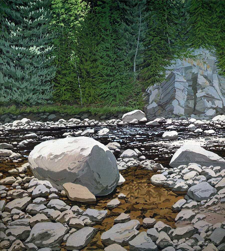 Ti offriamo una riproduzione artigianale su tela dell'opera famosa 'Lower Ducktrap' di Neil Welliver, dal Museo delle Riproduzioni.