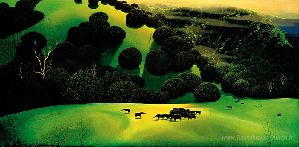 Ti offriamo una riproduzione artigianale su tela dell'opera famosa 'Mandria di cavalli' di Eyvind Earle, dal Museo delle Riproduzioni.