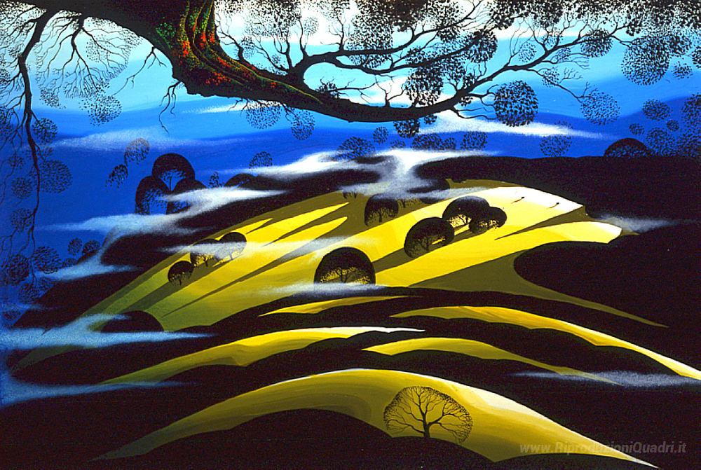 Ti offriamo una riproduzione artigianale su tela dell'opera famosa 'Mattina Campi' di Eyvind Earle, dal Museo delle Riproduzioni.