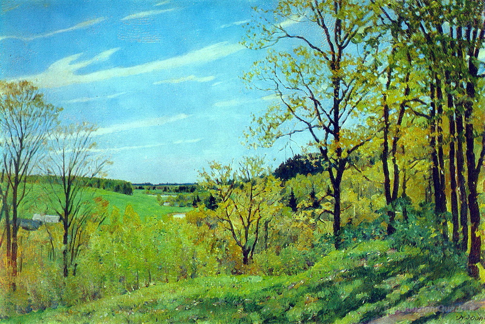 Ti offriamo una riproduzione artigianale su tela dell'opera famosa 'Mattina di maggio. Posto Nightingale. Ligachevo' di Konstantin Yuon, dal Museo delle Riproduzioni.