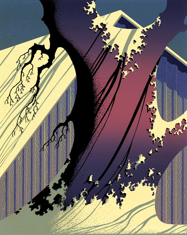 Ti offriamo una riproduzione artigianale su tela dell'opera famosa 'Mauve Barn' di Eyvind Earle, dal Museo delle Riproduzioni.