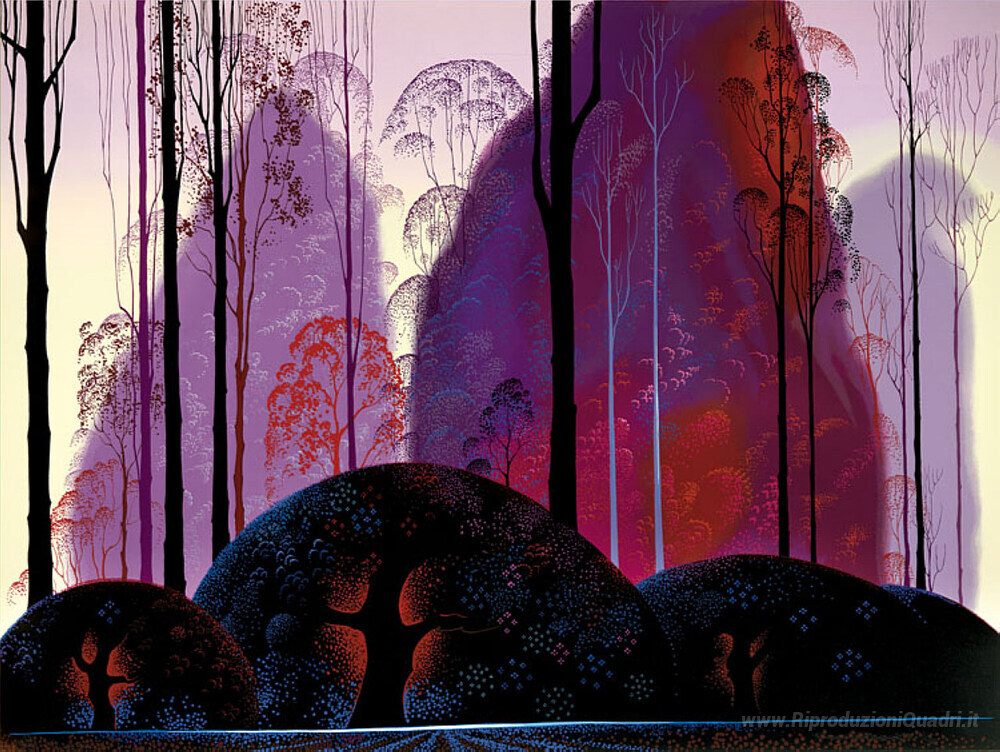 Ti offriamo una riproduzione artigianale su tela dell'opera famosa 'Mauve, rosso e viola' di Eyvind Earle, dal Museo delle Riproduzioni.