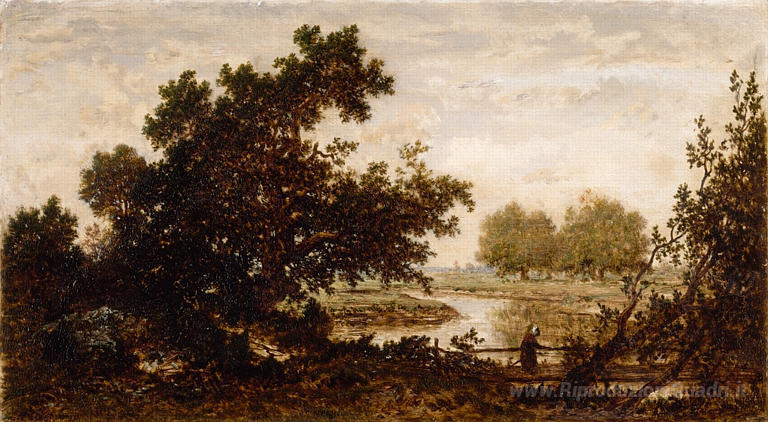 Ti offriamo una riproduzione artigianale su tela dell'opera famosa 'MEADOWS attraversato da un fiume' di Theodore Rousseau, dal Museo delle Riproduzioni.