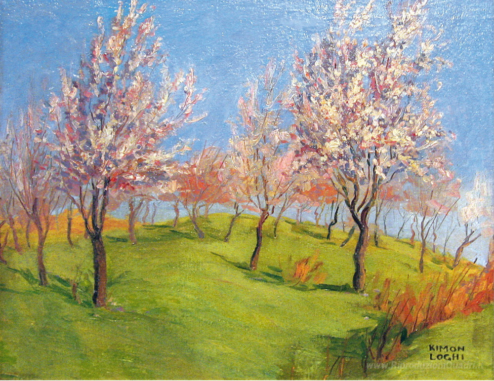 Ti offriamo una riproduzione artigianale su tela dell'opera famosa 'Meli in fiore' di Kimon Loghi, dal Museo delle Riproduzioni.