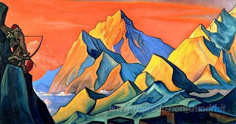 Ti offriamo una riproduzione artigianale su tela dell'opera famosa 'Messaggio di Shambhala (Arrow-lettera)' di Nicholas Roerich, dal Museo delle Riproduzioni.