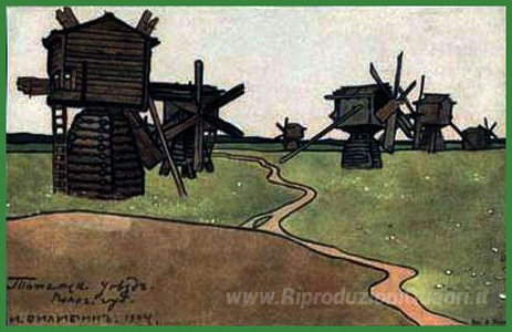 Ti offriamo una riproduzione artigianale su tela dell'opera famosa 'Mills' di Ivan Bilibin, dal Museo delle Riproduzioni.