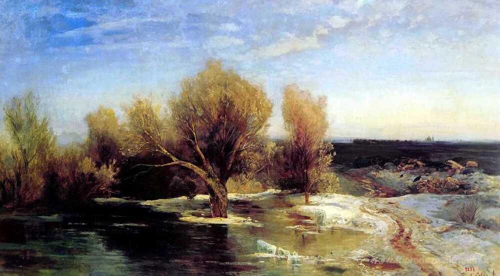 Ti offriamo una riproduzione artigianale su tela dell'opera famosa 'Molla' di Aleksey Savrasov, dal Museo delle Riproduzioni.