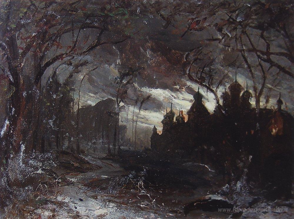 Ti offriamo una riproduzione artigianale su tela dell'opera famosa 'Monastero di Ipatiev nella notte invernale' di Aleksey Savrasov, dal Museo delle Riproduzioni.