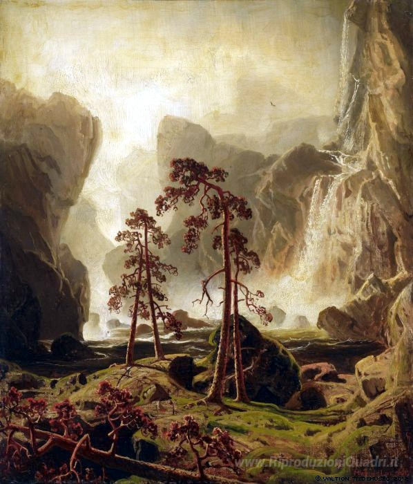 Ti offriamo una riproduzione artigianale su tela dell'opera famosa 'Montagne e una cascata' di Marcus Larson, dal Museo delle Riproduzioni.
