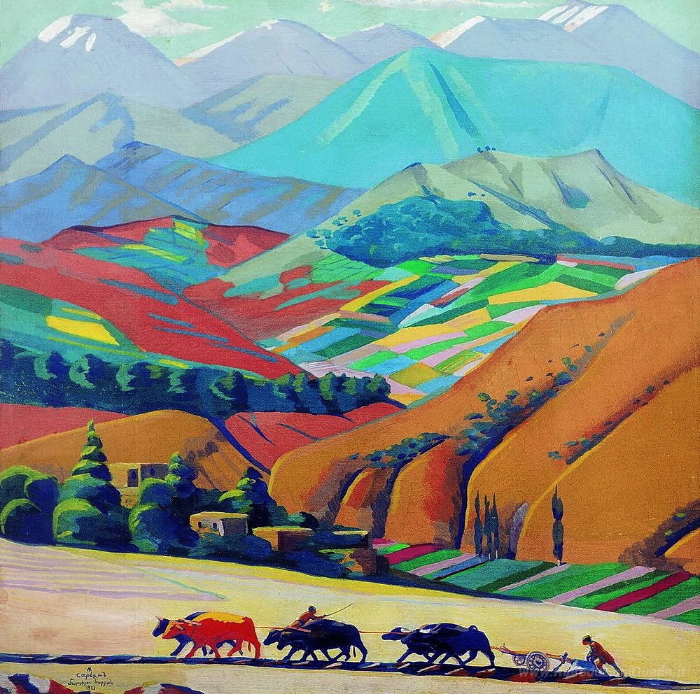 Ti offriamo una riproduzione artigianale su tela dell'opera famosa 'Montagne' di Martiros Saryan, dal Museo delle Riproduzioni.