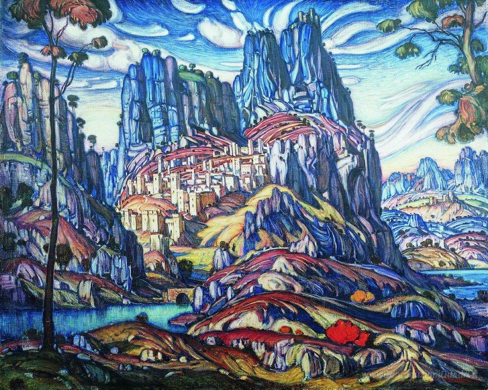 Ti offriamo una riproduzione artigianale su tela dell'opera famosa 'Monte San Giorgio' di Konstantin Bogaevsky, dal Museo delle Riproduzioni.