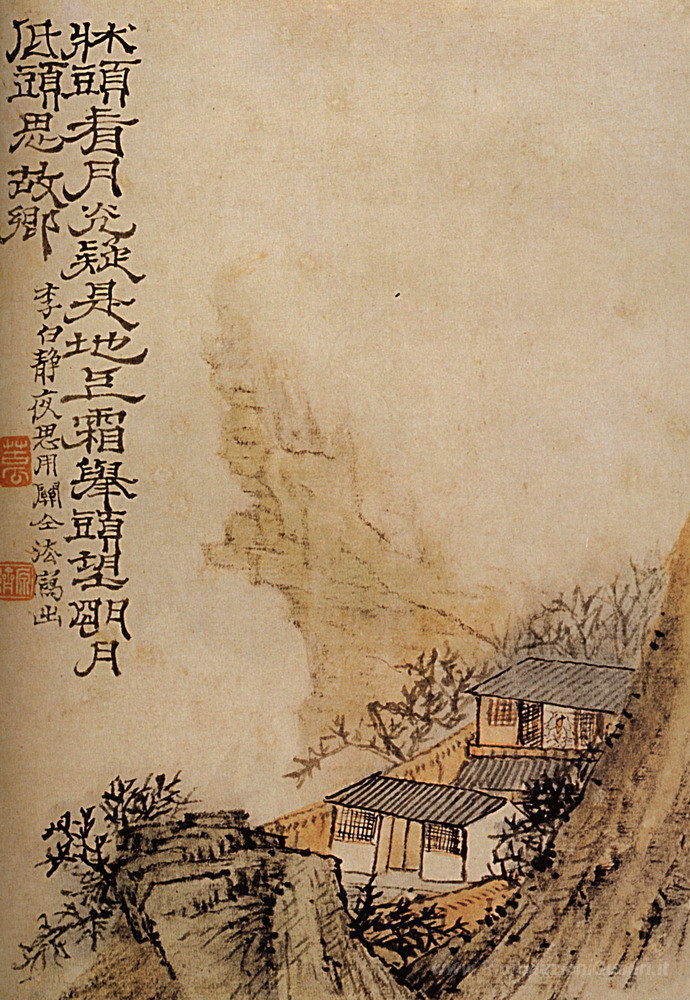 Ti offriamo una riproduzione artigianale su tela dell'opera famosa 'Moonlight sulla scogliera' di Shitao, dal Museo delle Riproduzioni.