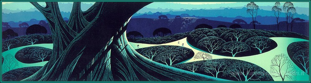 Ti offriamo una riproduzione artigianale su tela dell'opera famosa 'Moonlit Campi' di Eyvind Earle, dal Museo delle Riproduzioni.