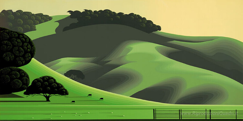 Ti offriamo una riproduzione artigianale su tela dell'opera famosa 'Morbidi Prati verdi' di Eyvind Earle, dal Museo delle Riproduzioni.