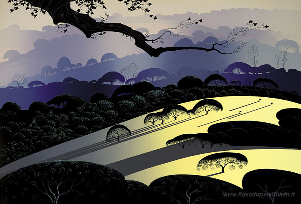 Ti offriamo una riproduzione artigianale su tela dell'opera famosa 'Morning Mist' di Eyvind Earle, dal Museo delle Riproduzioni.