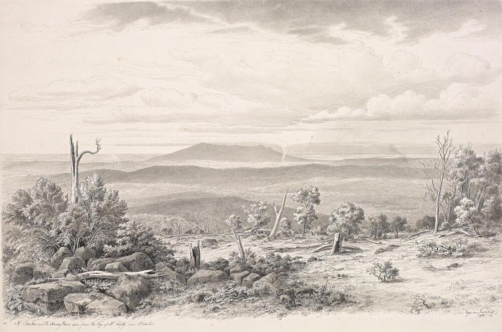 Ti offriamo una riproduzione artigianale su tela dell'opera famosa 'Mt Barker e la pianura Murray visto dalla cima del monte Lofty n' di Eugene von Guerard, dal Museo delle Riproduzioni.