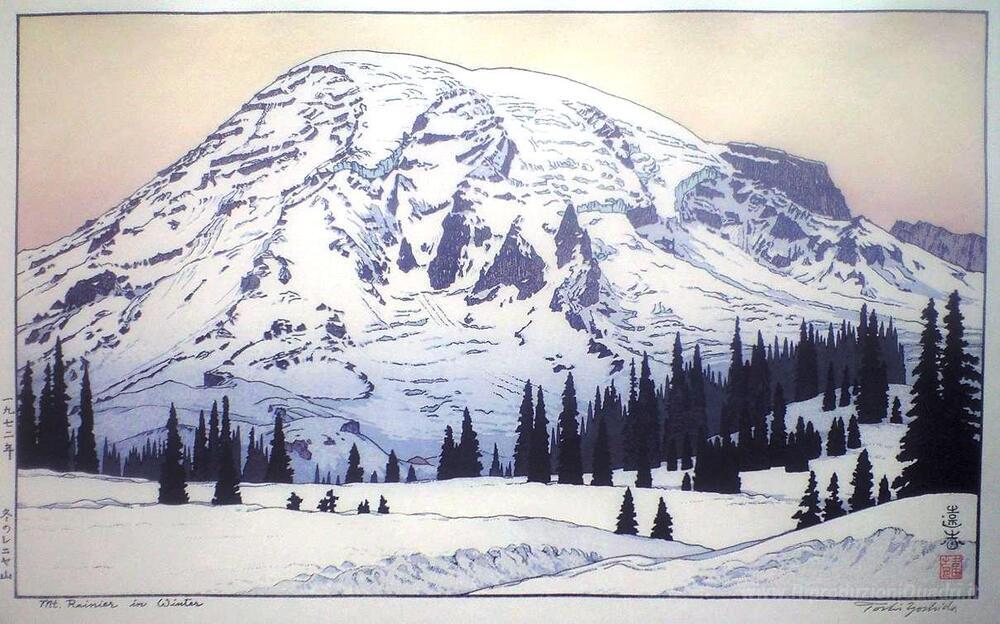 Ti offriamo una riproduzione artigianale su tela dell'opera famosa 'Mt. Rainier in inverno' di Toshi Yoshida, dal Museo delle Riproduzioni.