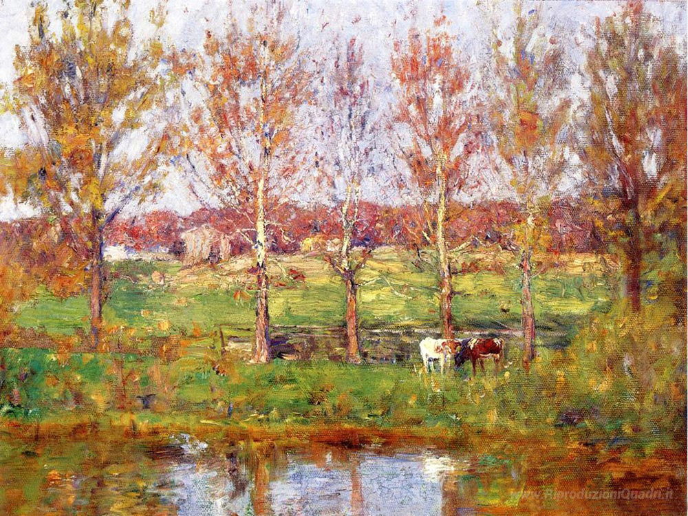 Ti offriamo una riproduzione artigianale su tela dell'opera famosa 'Mucche dalla Corrente' di T. C. Steele, dal Museo delle Riproduzioni.