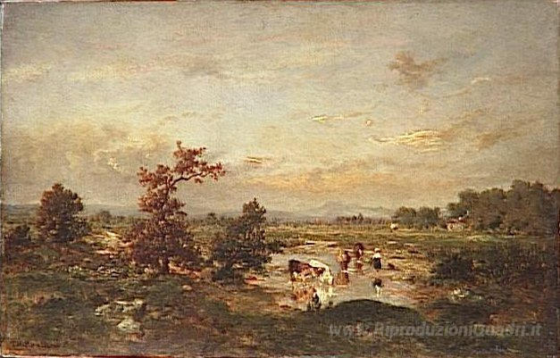 Ti offriamo una riproduzione artigianale su tela dell'opera famosa 'Mucche in mare' di Theodore Rousseau, dal Museo delle Riproduzioni.