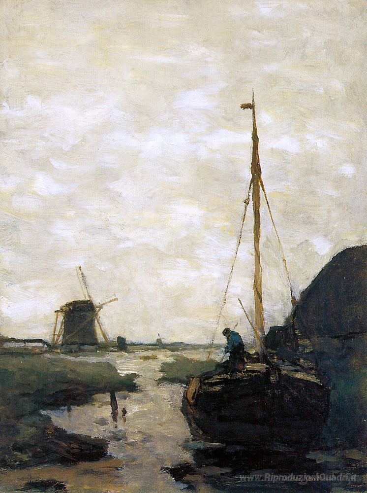Ti offriamo una riproduzione artigianale su tela dell'opera famosa 'Nave in polder canale' di Johan Hendrik Weissenbruch, dal Museo delle Riproduzioni.