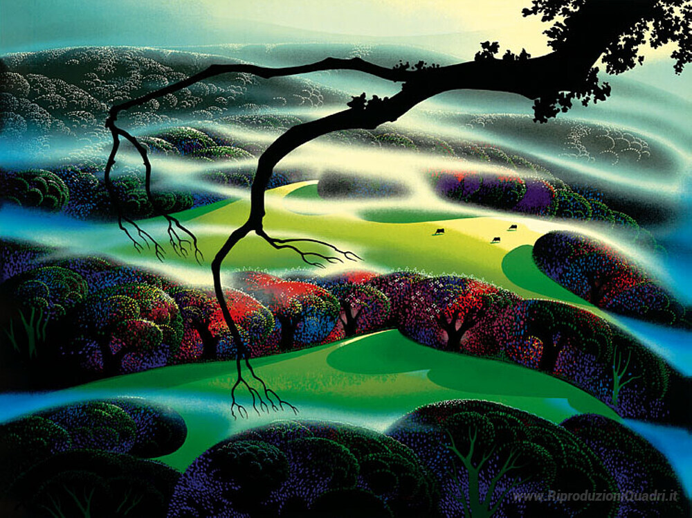 Ti offriamo una riproduzione artigianale su tela dell'opera famosa 'Nebbia avvolgeva' di Eyvind Earle, dal Museo delle Riproduzioni.