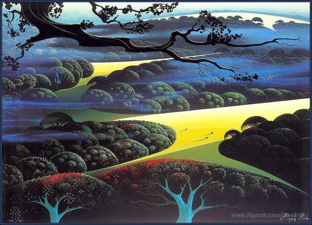 Ti offriamo una riproduzione artigianale su tela dell'opera famosa 'Nebbia blu' di Eyvind Earle, dal Museo delle Riproduzioni.