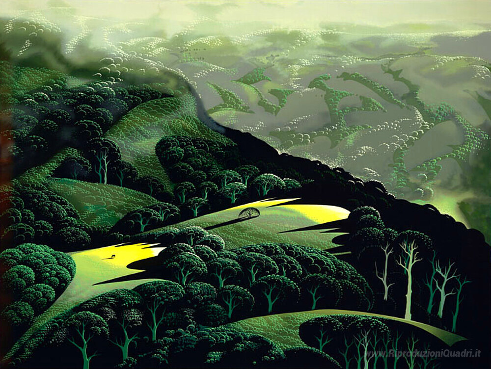 Ti offriamo una riproduzione artigianale su tela dell'opera famosa 'Nebbia e Storm e pioggia' di Eyvind Earle, dal Museo delle Riproduzioni.