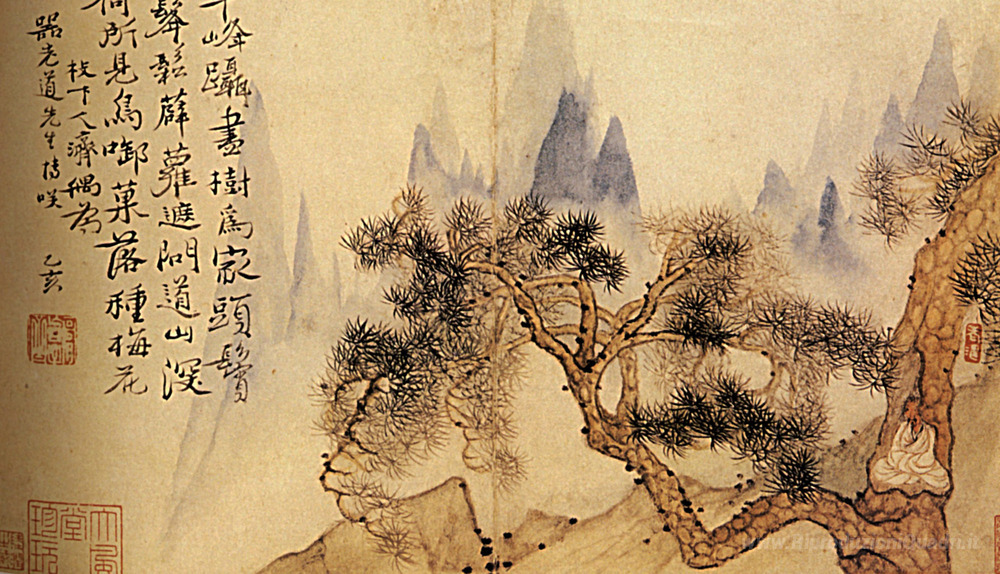 Ti offriamo una riproduzione artigianale su tela dell'opera famosa 'Nella meditazione, ai piedi delle montagne impossibili' di Shitao, dal Museo delle Riproduzioni.