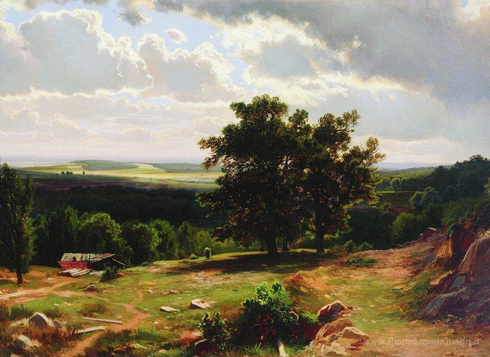Ti offriamo una riproduzione artigianale su tela dell'opera famosa 'Nelle vicinanze di Düsseldorf' di Ivan Shishkin, dal Museo delle Riproduzioni.