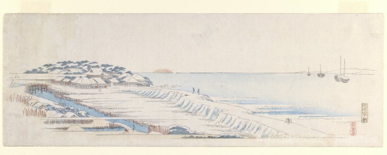 Ti offriamo una riproduzione artigianale su tela dell'opera famosa 'Neve Alba a Susaki' di Hiroshige, dal Museo delle Riproduzioni.