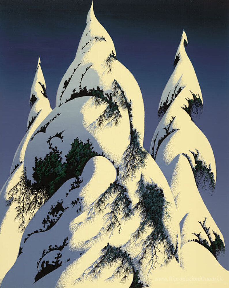 Ti offriamo una riproduzione artigianale su tela dell'opera famosa 'Neve Alberi' di Eyvind Earle, dal Museo delle Riproduzioni.
