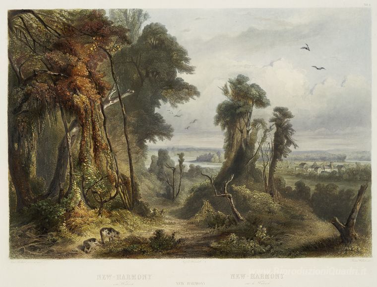Ti offriamo una riproduzione artigianale su tela dell'opera famosa 'New Harmony sulla Wabash, piatto 2 dal volume 2 di "Travels in d' di Karl Bodmer, dal Museo delle Riproduzioni.