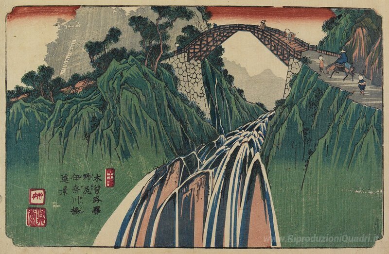 Ti offriamo una riproduzione artigianale su tela dell'opera famosa 'No.41 Distant View di Kanagawa ponte nei pressi della stazione N' di Keisai Eisen, dal Museo delle Riproduzioni.