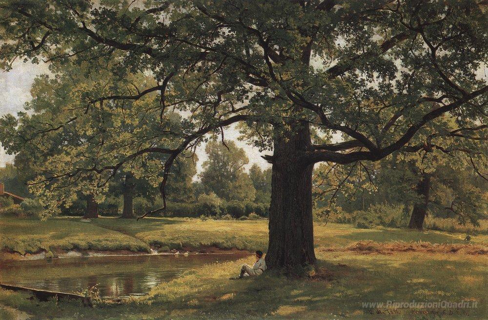 Ti offriamo una riproduzione artigianale su tela dell'opera famosa 'Oaks a Old Peterhof' di Ivan Shishkin, dal Museo delle Riproduzioni.
