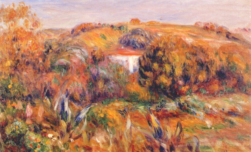 Ti offriamo una riproduzione artigianale su tela dell'opera famosa 'Paesaggio a Cagnes' di Pierre-Auguste Renoir, dal Museo delle Riproduzioni.