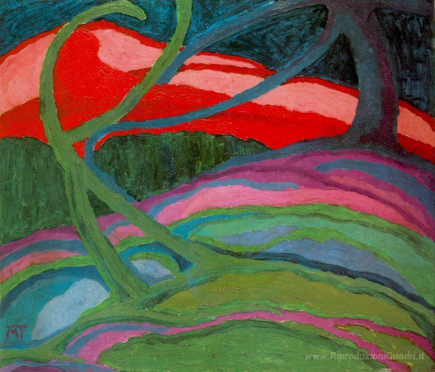 Ti offriamo una riproduzione artigianale su tela dell'opera famosa 'Paesaggio a Colori scuri (alberi)' di Janos Mattis-Teutsch, dal Museo delle Riproduzioni.