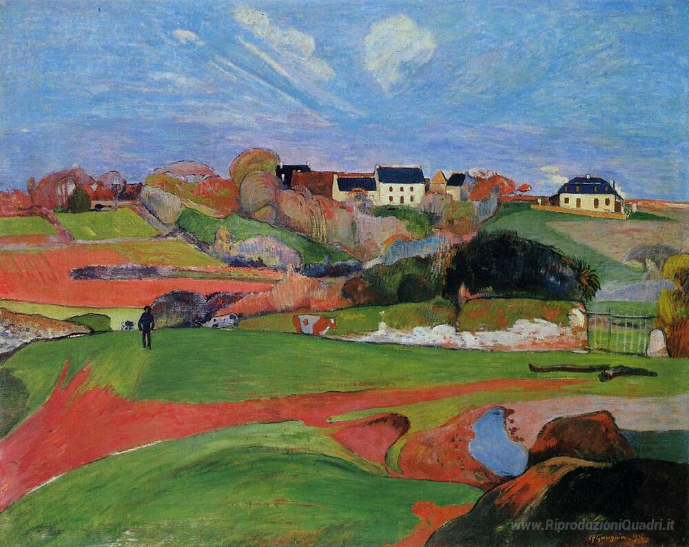 Ti offriamo una riproduzione artigianale su tela dell'opera famosa 'Paesaggio a Le Pouldu' di Paul Gauguin, dal Museo delle Riproduzioni.