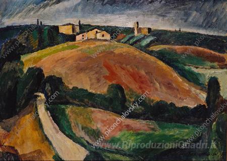 Ti offriamo una riproduzione artigianale su tela dell'opera famosa 'Paesaggio a Siena' di Pyotr Konchalovsky, dal Museo delle Riproduzioni.