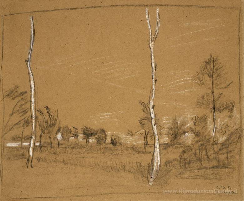Ti offriamo una riproduzione artigianale su tela dell'opera famosa 'Paesaggio con alberi di betulla' di Paula Modersohn-Becker, dal Museo delle Riproduzioni.
