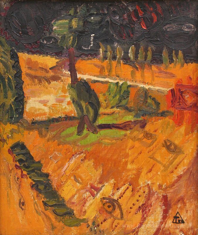 Ti offriamo una riproduzione artigianale su tela dell'opera famosa 'Paesaggio con albero' di Ion Tuculescu, dal Museo delle Riproduzioni.