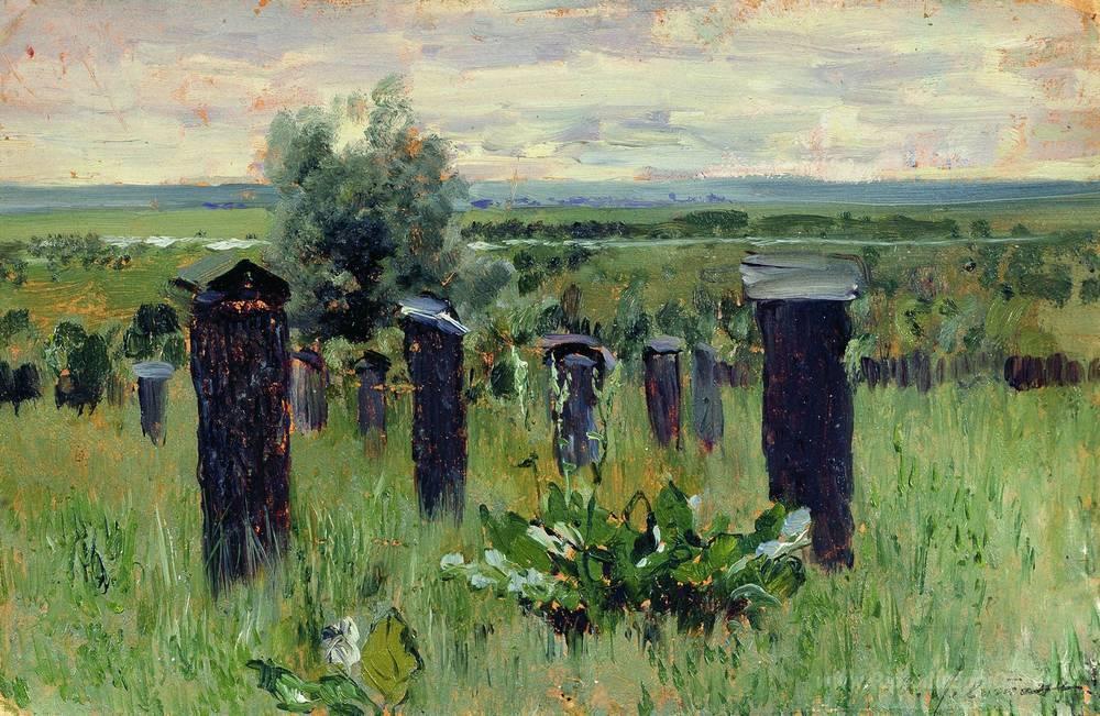 Ti offriamo una riproduzione artigianale su tela dell'opera famosa 'Paesaggio con alveari' di Isaac Levitan, dal Museo delle Riproduzioni.
