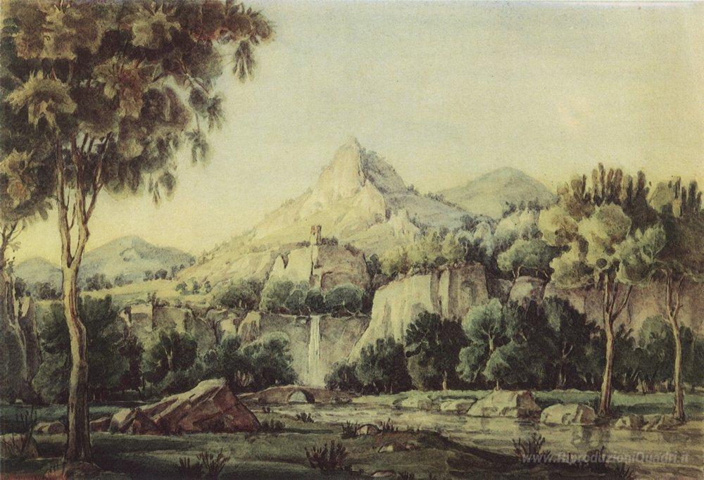 Ti offriamo una riproduzione artigianale su tela dell'opera famosa 'Paesaggio con cascata e ponte' di Konstantin Bogaevsky, dal Museo delle Riproduzioni.