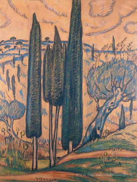 Ti offriamo una riproduzione artigianale su tela dell'opera famosa '?Paesaggio con cipressi' di Constantine Maleas, dal Museo delle Riproduzioni.