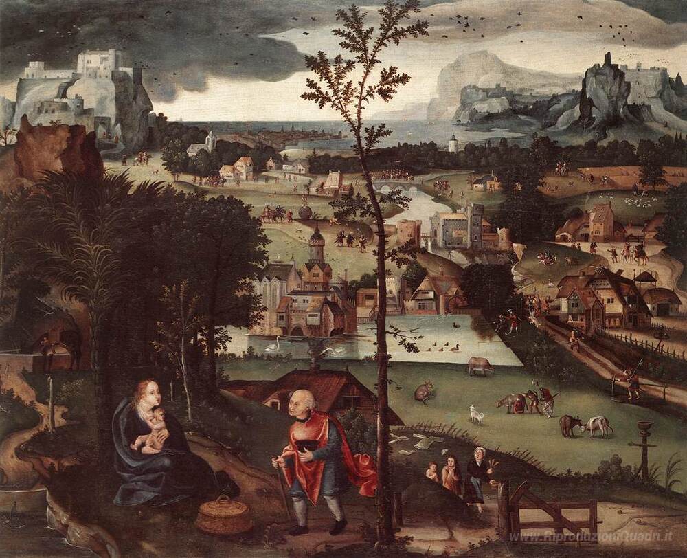 Ti offriamo una riproduzione artigianale su tela dell'opera famosa 'Paesaggio con il Riposo durante la Fuga' di Joachim Patinir, dal Museo delle Riproduzioni.