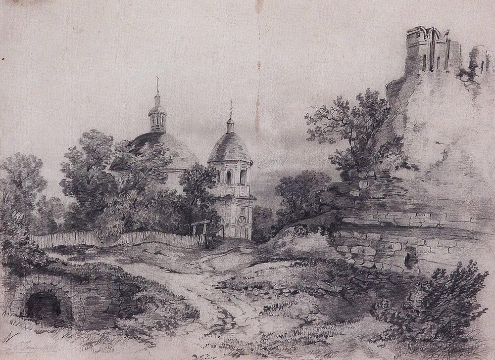 Ti offriamo una riproduzione artigianale su tela dell'opera famosa 'Paesaggio con la Chiesa e le rovine' di Aleksey Savrasov, dal Museo delle Riproduzioni.