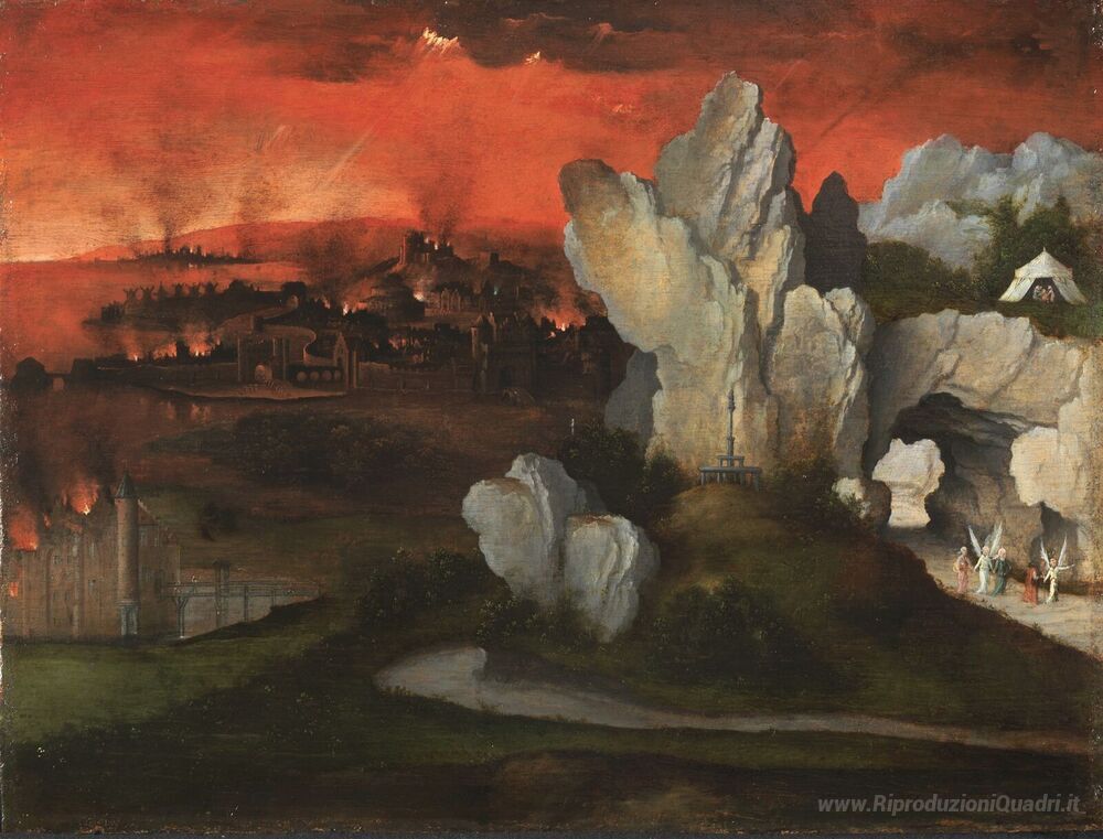 Ti offriamo una riproduzione artigianale su tela dell'opera famosa 'Paesaggio con la distruzione di Sodoma e Gomorra' di Joachim Patinir, dal Museo delle Riproduzioni.