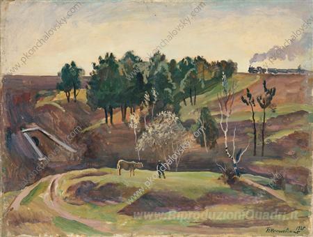 Ti offriamo una riproduzione artigianale su tela dell'opera famosa 'Paesaggio con la ferrovia' di Pyotr Konchalovsky, dal Museo delle Riproduzioni.
