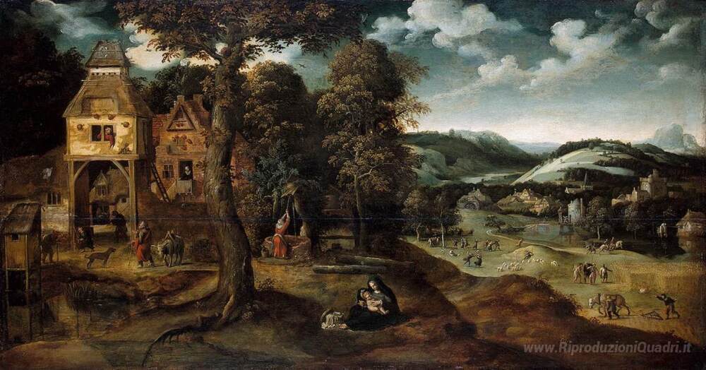 Ti offriamo una riproduzione artigianale su tela dell'opera famosa 'Paesaggio con la fuga in Egitto' di Joachim Patinir, dal Museo delle Riproduzioni.