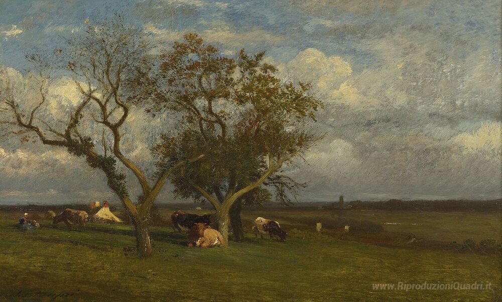 Ti offriamo una riproduzione artigianale su tela dell'opera famosa 'Paesaggio con le mucche' di Jules Dupre, dal Museo delle Riproduzioni.