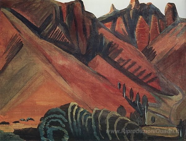 Ti offriamo una riproduzione artigianale su tela dell'opera famosa 'Paesaggio con montagne. Surb Khach rocce. Gohtan.' di Martiros Saryan, dal Museo delle Riproduzioni.